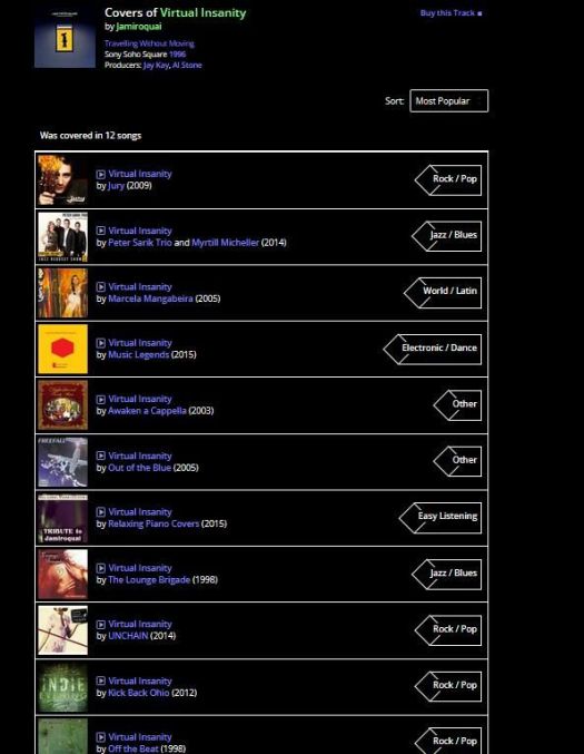 Take what you see here with a bucket of salt. Particularily when it comes to Jamiroquais stolen music. Like all these type of Music websites or so called online encyclopedias that spring up and declare them selves to be some sort of arbiter of Music THEY ARE NO SUCH THING. The fact that someone called ย Nadav Poraz’ssor his mates on Who sampled who decide what that something is or is not ripped off or whether it should or should not appear on the website is TOTALLY IRELLEVENT. ย People have bloody ears and all 19870โs/1980โs Funksters Know that Jamiroquai are a consumate plagiarists. So another example is Virtual Insanity. when you go onto my review for the next Album The return of The Space Cowboy