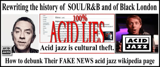These are cultural thieves, enemies of Black culture whom like all serpents masquerade as friends. Wolves in sheepโs clothing who think they can do what they have done for thousands of years. Copy something, adopt its identity then rewrite history and claim to be the originals. They are trying to steal the Legacy of SOUL/R&B and rebrand it as Acid Jazz/E.D.M. These cultural thieves are front-men for a plan to effectively re-write the History of 20th Century Soul. Through fraudulent re-branding of SOUL, the suppression of the truth and a massive global disinformation campaign as you can see here on Wikipedia. And not just on Wikipedia.