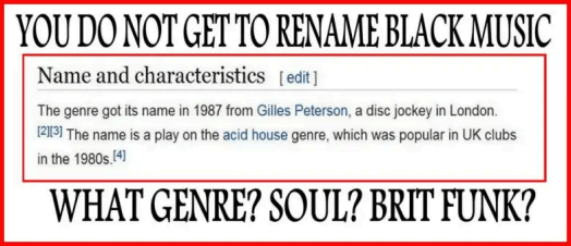 On Wikipedia they erase all these bands singers and acts from History. Then Claim that Gilles Peterson “invented” a Black music genre in 1987 called acid jazz. There is no such genre in Black music. All they have done is replace the words Rare Groove with the name of their infiltrator record label then claim that itโs a new music genre called acid jazz.