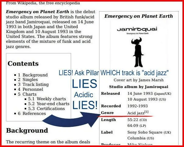 When you tell so many lies itโs difficult to keep track of what you have said. First it was acid jazz the invention of Gilles Peterson. Then they tried to claim that Acid Jazz was a 1980โs sub-genre of Jazz. No it was not. No such genre existed. Now they claim that Acid Jazz is a form of FUNK separate to, well FUNK but they canโt tell you what it is. Recently they have started to claim that the first three albums are Acid Jazz and the rest are not. So what that means is they are claiming that 1970โs Jazz Funk is actually Gilles Petersons invention even though acid jazz records was created in 1987. And that the post Disco sound of Synkronised, A Funk Odyssey etc are not. Confusingly though they still claim that they are a โFunk and an Acid Jazzโ band on their Wikipedia articles for those albums. So Gilles Peterson is responsible for the sound of Synkronised and all the other albums that came later. Confused? Yeah so are they! don’t worry, I will tell you what all the sounds on those albums are as well. They can’t fool me on any of their albums as to what style of music they are playing. Or where they probably stole the music from.