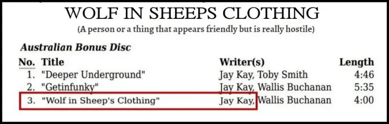 Now you know where all these sounds come from let’s take a look at the credits. Who claims to have written what. …. And what d’ya know Jay Kay claims credit on every track. Toby Smith is co- credited for six tracks and Nick van Gelder is co-credited for Stevie Wonder. So they would have history believe they are responsible for all the FUNK you see above. Note that their mates in the music industry have ensured that they are free of copywrite strikes. So the copycat who tellโs everyone that he โdoesnโt use any outside Influencesโ and that โTaking other peoples musicโ is plagiarism wantsโ history to believe that he wrote all this music by himself. And Gilles Peterson and Eddie Pillar want history to believe that this isnโt Black music but Acid Jazz invented here in London. What do you think?